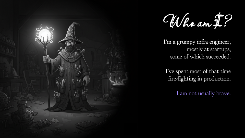 This is Gemini’s portrayal of me as a wizard. The shell-shocked look on my face is spot-on, because I’ve spent most of my career fixing horrifyingly broken software. I’m now middle-aged, a bit grumpy, and a lot skeptical. I am not usually brave. I am not into the big-bang rewrite.