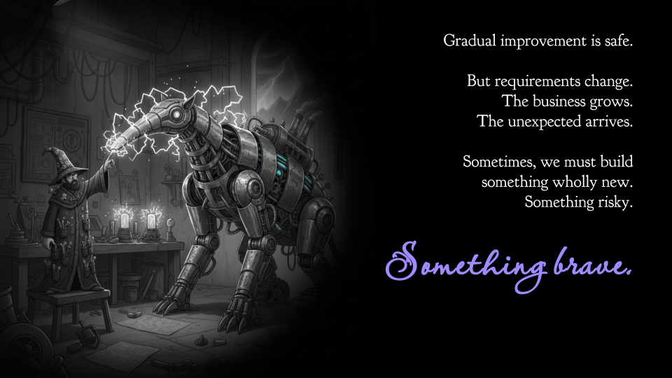 I prefer gradual improvement. I like local maxima. But sometimes, requirements change, the business grows, the unexpected arrives, and we are grudgingly forced to build something completely new. Something risky. Something a bit brave.