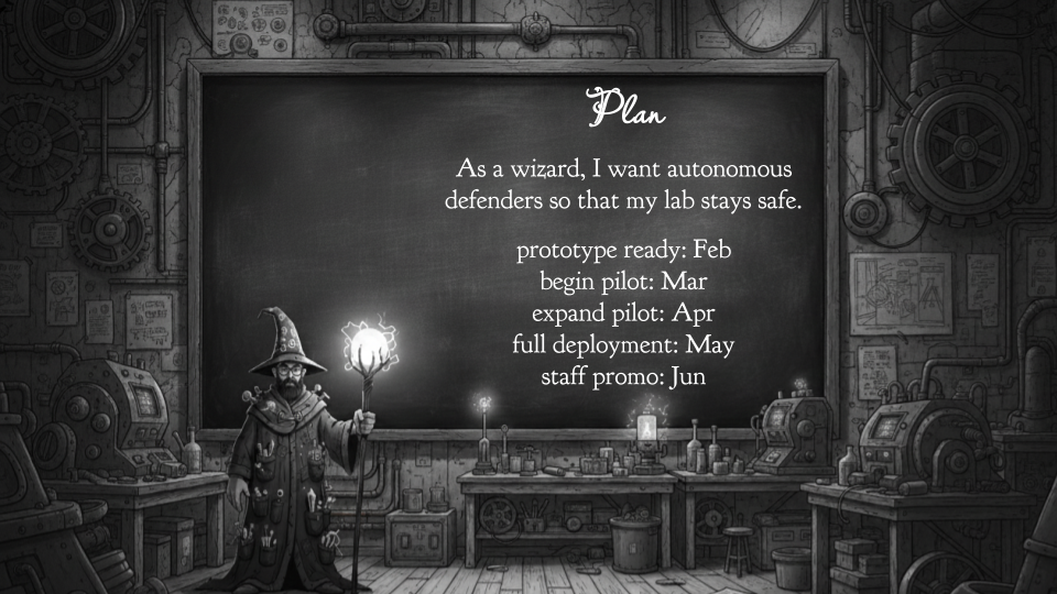 Every brave project begins with a plan. Often, a humble user story: “as a wizard, I want autonomous defenders so I can stay in my lab and not talk to anyone.” And of course, our brave project comes with milestones, culminating in my triumphant staff promotion.