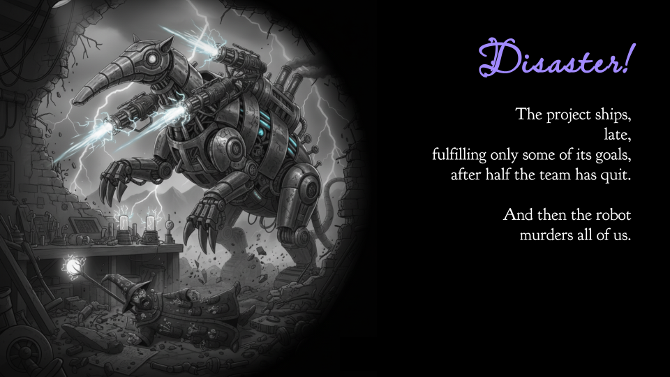 ...which is complete and utter disaster. Our project will almost certainly be late. It will solve only part of the problem. After all the delays and thrashing, half the team will quit or transfer. And then, just as the robot automatons are murdering all of us, we’ll realize that we have drifted ever so slightly off-spec.