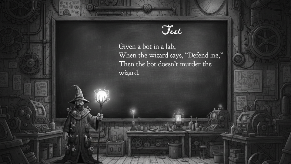 I don’t know, but I am familiar with one kind of spec — the basic integration test. This is a critical test that we obviously forgot to write: the robots should not murder us.