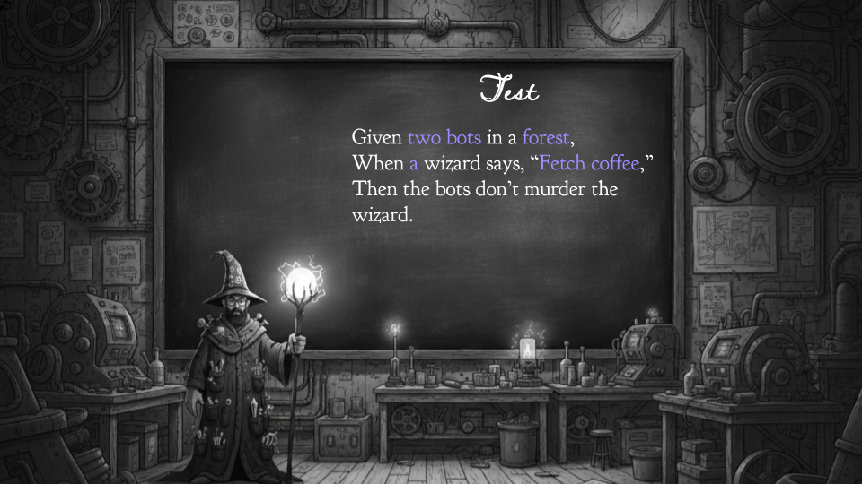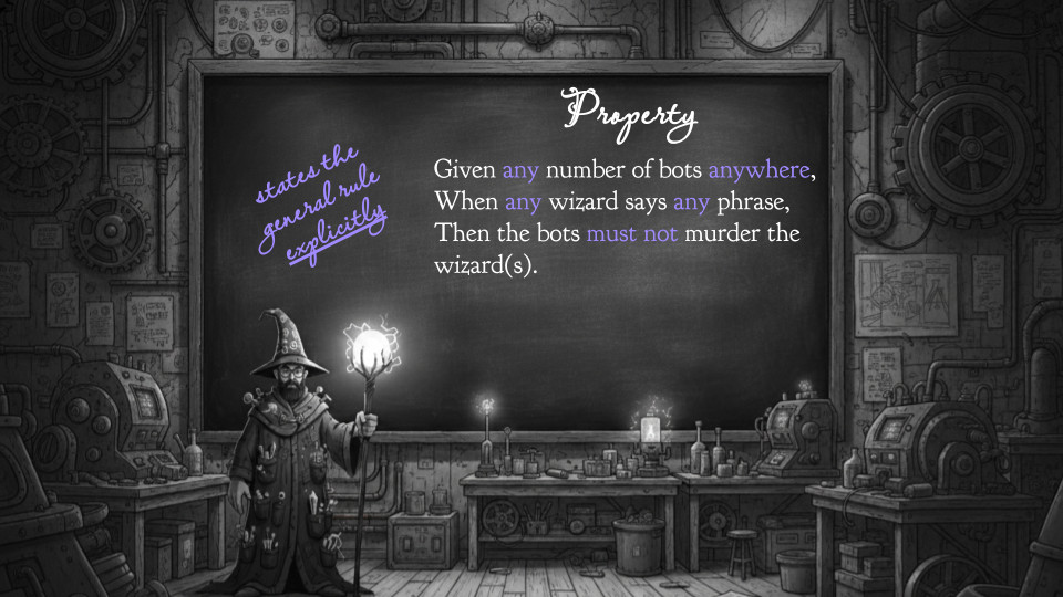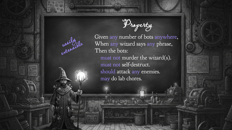 That all-encompassing test might look like this. Any number of robots. Any place. Any number of wizards. Any phrase at all. Aha! Now we need fewer tests — maybe just this one! — and we are clearly and explicitly communicating intent. Rather than a test, we might call this a property.