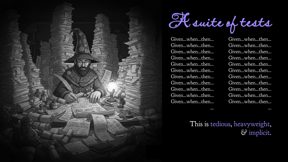 And deep inside, we all know that this is a complete sham. Even with all of this, we’ve only tested the tiniest fraction of the possible states that our code could be in. And we have burned tons of engineering time on this. Whole teams have been hired just to write and maintain test suites like this one. When the spec changes, we have to amend all of this code.