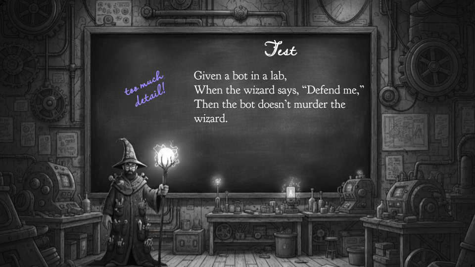 The root of the problem is that the test suite — this spec — is mired in trivial details. One robot. In the lab. One wizard. One specific command. It sounds like we’re playing Clue! Ideally, we would condense all of this into one much more general test.