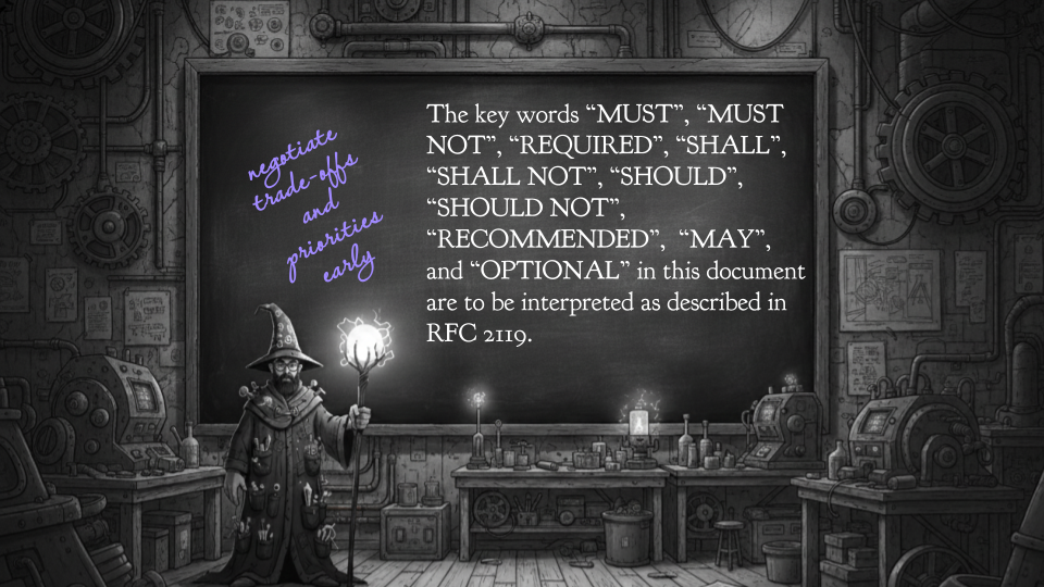 It’s all starting to sound a bit like RFC 2119, the number one banger of 1997! In two pages, this RFC defines the terminology for requirement levels, which is a really simple, powerful idea: we should distinguish between absolute requirements, recommendations, and nice-to-haves. Thinking this way forces us to navigate tradeoffs and competing priorities very early.