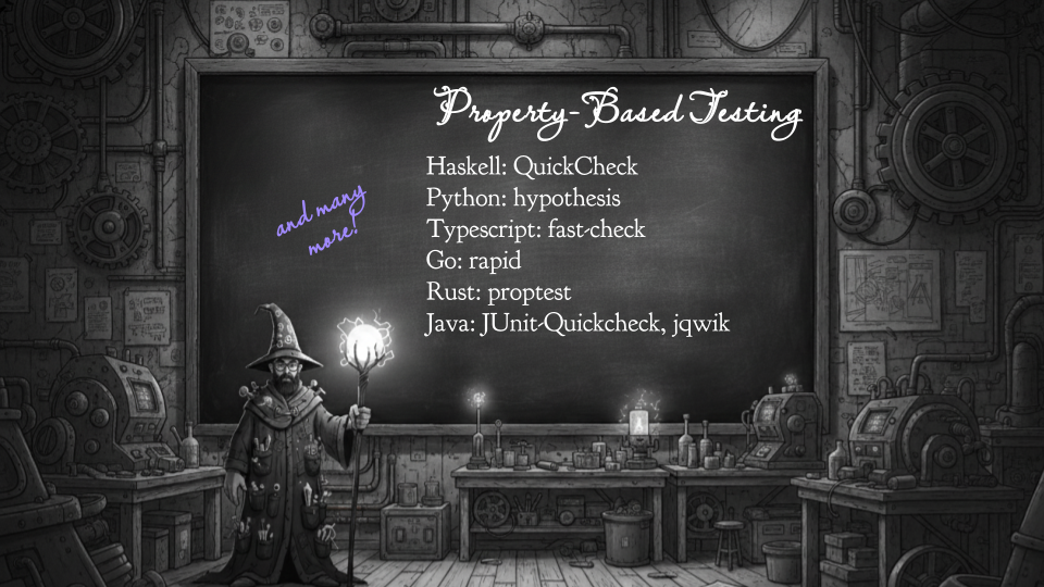 Unfortunately, QuickCheck was written in Haskell, so only seven people in the world cared — and all of them were busy writing the Haskell compiler. But over the next 25 years, we were able to decrypt these tomes of wisdom and translate them into all the languages that all of us actually use. So now, no matter what language you work in, you have a really good PBT library available to you.